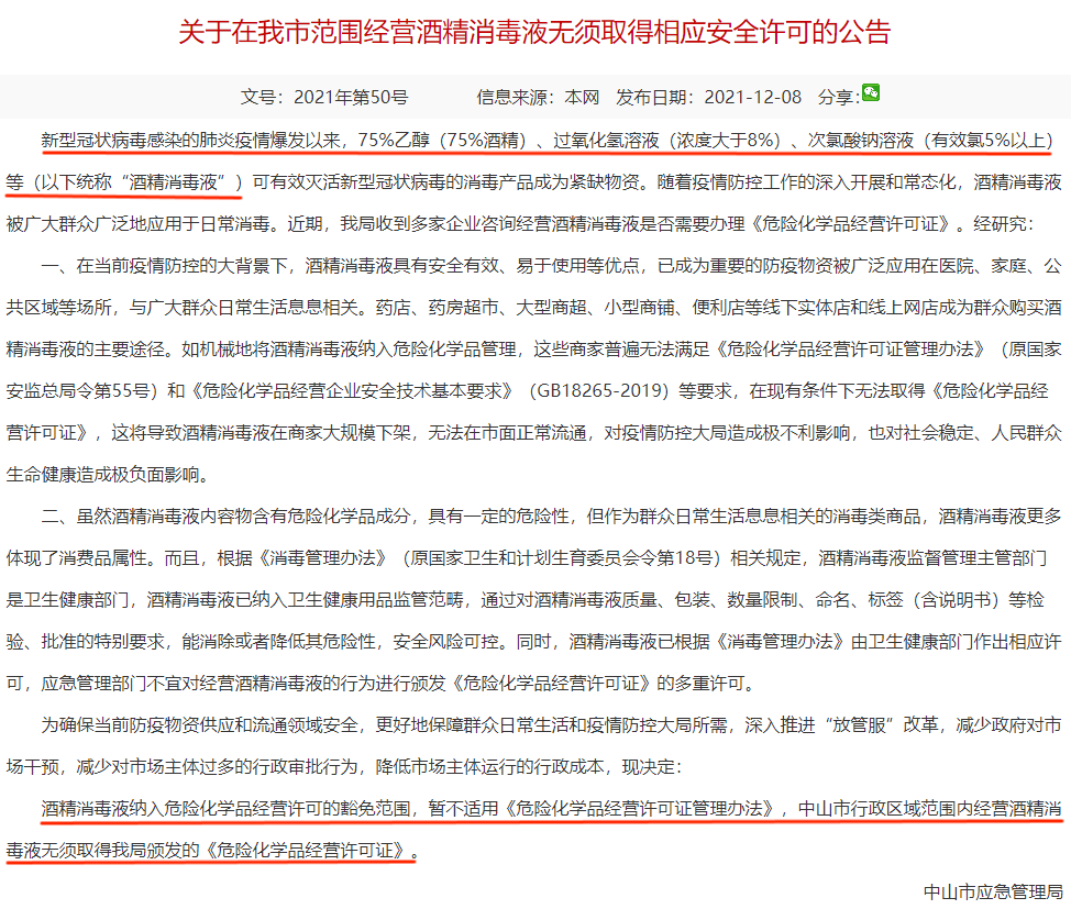 但這里要提醒下大家,各地的政策會有所差異,例如廣東省中山市,于2021年12月8號,發布了一項公告,公告明確說明了酒精消毒液,納入了危化證的豁免范圍,暫不適用《危險化學品經營許可證管理辦法》,在中山市行政區域范圍內,經營酒精消毒液,不需要辦理危化證。